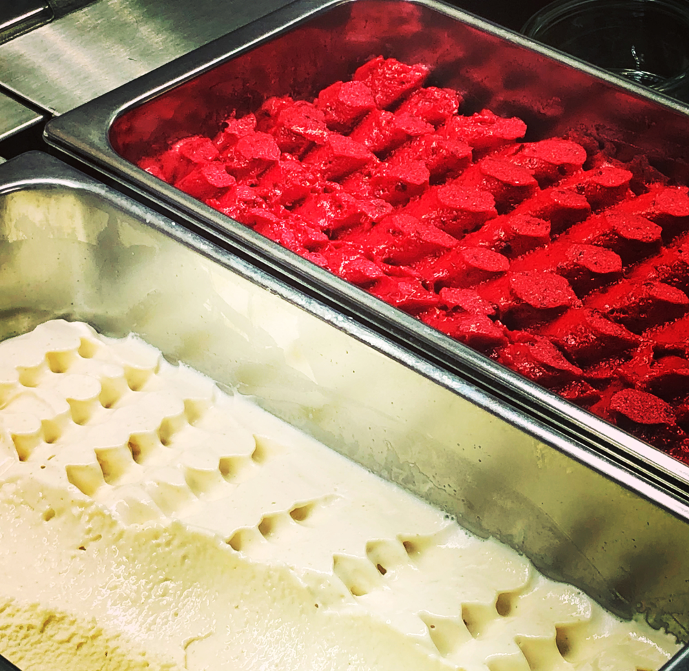 Die Nussmarks beispielsweise bestehen aus 100% Nuss - was manchmal nur noch selten selbstverständlich ist. Damit wir außerdem wissen, was drin ist, machen wir vieles selbst. So stellen wir unsere Soßen und Toppings für die Eisbecher selbst her, in unserer hauseigenen Backstube wird gebacken, was das Zeug hält, in unserem Eislabor tüfteln wir ständig an neuen Eisrezepten. Auch unsere Hauslimos, den Chaisirup und unsere dunkle Schokolade stellen wir selbst her. Probier doch mal!